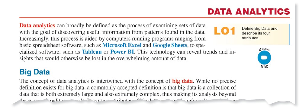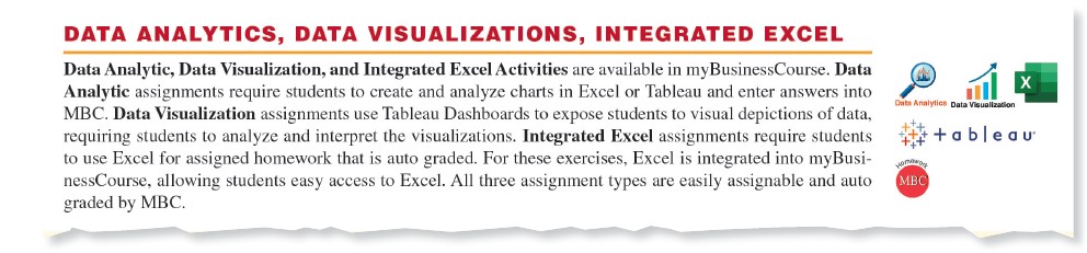 MBC that requires students to use Excel. These assignments are auto-graded and scores are captured in the MBC gradebook. - Data Analytics: we have expanded Data Analytics coverage in this edition.